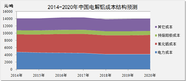加權(quán)成本結(jié)構(gòu)。2014年我國(guó)氧化鋁生產(chǎn)成本主要由氧化鋁、電力及預(yù)焙陽極三個(gè)方面構(gòu)成。其中,氧化鋁成本為4846.4元/噸,占比34.4%;電力成本為4809元/噸,占比34.1%;預(yù)焙陽極成本為1169.6元/噸,占比8.3%。研究預(yù)測(cè),2015-2020年期間氧化鋁成本占比將逐步提升至37.7%,電力成本占比將逐步下降至29.9%,預(yù)焙陽極成本占比穩(wěn)定。