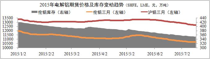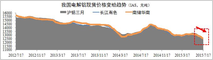 發(fā)稿時(shí)間:2015-07-18電解鋁現(xiàn)貨價(jià)格繼續(xù)回落。監(jiān)控?cái)?shù)據(jù)顯示,7月上旬電解鋁現(xiàn)貨價(jià)格繼續(xù)保持下滑趨勢,且下滑幅度有所擴(kuò)大。截至7月17日,長江有色現(xiàn)貨價(jià)格跌至12503元/噸,南儲華南跌至12543元/噸,月化日均跌幅分別為0.14%和0.15%,同比分別擴(kuò)大0.03和0.05個(gè)百分點(diǎn)。從數(shù)據(jù)分布上看,目前現(xiàn)貨價(jià)格與滬鋁三月期貨價(jià)格之間的差值已收窄至100元左右,預(yù)計(jì)該趨勢將進(jìn)一步延續(xù)。