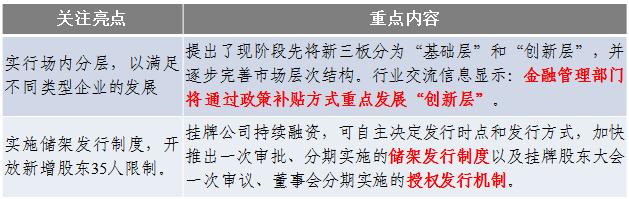 新三板市場再迎里程碑。中國證監會于11月20日發布了《關于進一步推進全國中小企業股份轉讓系統發展的若干意見》,進一步明確了新三板的獨立市場地位和立足于服務創新型、創業型和成長型中小微企業的市場定位,同時為企業在證券市場的轉板預留了空間。此外,《意見》“現階段暫不實行連續競價交易”的規定在一定程度上限制了企業的板內融資便利性。