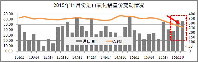 進口市場方面:統(tǒng)計期內,進口氧化鋁市場價格波動趨勢基與國內市場基本一致。進口量方面,10月全國進口氧化鋁58萬噸,11月進口56萬噸,較去年同期增長27%,環(huán)比有所回落;價格方面,11月CIF均價319美元,折合人民幣2040元/噸,環(huán)比下降5.1%。進口價格持續(xù)下跌折射出國際有色市場的悲觀氣氛仍在持續(xù),而內外價差將會轉化進口需求為國產需求。
