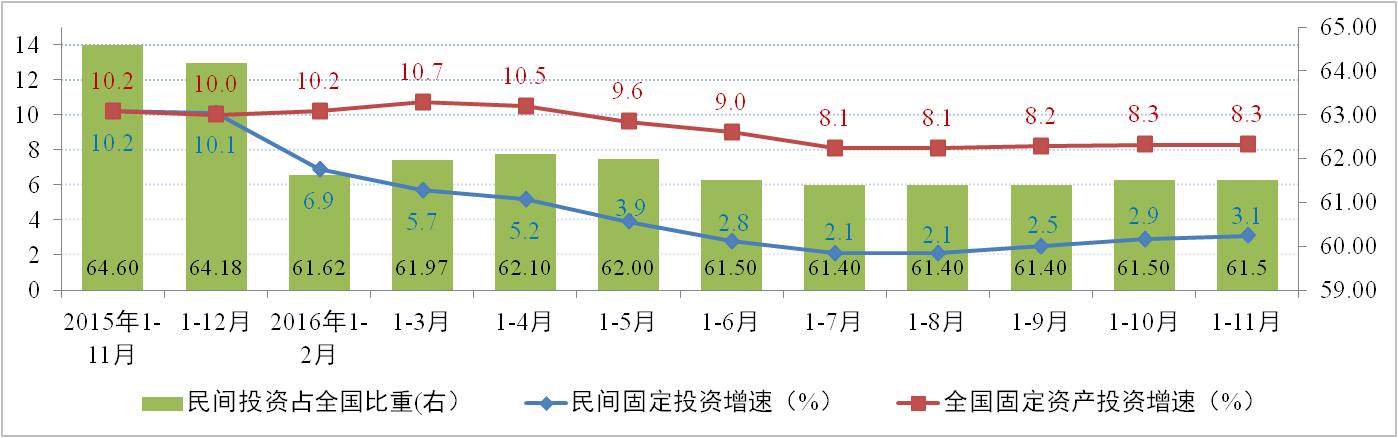 據(jù)國家統(tǒng)計(jì)局統(tǒng)計(jì)數(shù)據(jù)顯示,2016年1-11月,全國固定資產(chǎn)投資同比名義增長8.3%,基本呈現(xiàn)橫向上升態(tài)勢(shì)但增速較小,對(duì)應(yīng)了經(jīng)濟(jì)的L型特征。民間固定資產(chǎn)投資同比名義增長3.1%,增速環(huán)比上升0.2個(gè)百分點(diǎn)。民間固定資產(chǎn)投資占全國固定資產(chǎn)投資(不含農(nóng)戶)的比重為61.5%,與上月持平。