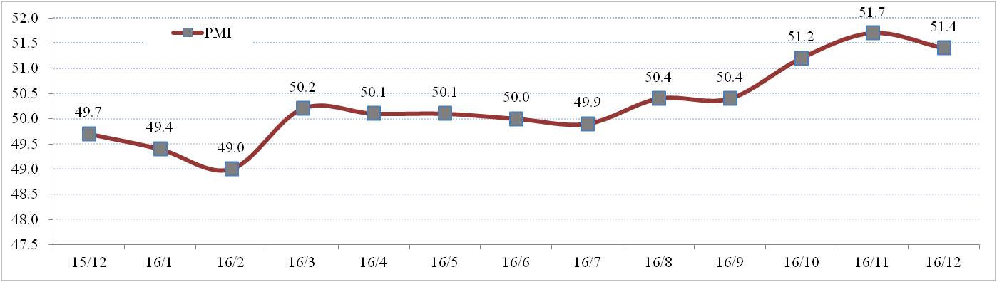 分析認(rèn)為:從2016年P(guān)MI表現(xiàn)來看,顯示經(jīng)濟(jì)運(yùn)行中的積極因素增多,經(jīng)濟(jì)下行壓力趨向減緩,企穩(wěn)向好發(fā)展態(tài)勢(shì)較為明顯,為2017年經(jīng)濟(jì)穩(wěn)定發(fā)展奠定了良好基礎(chǔ)。