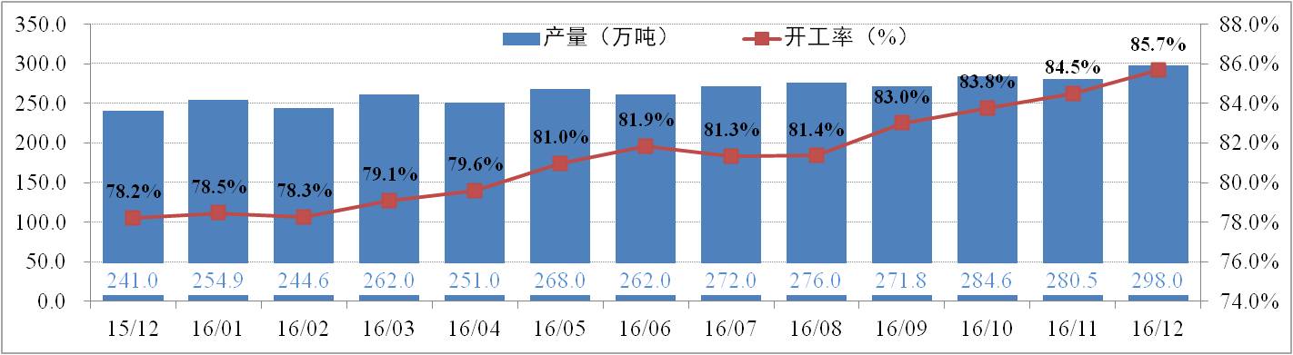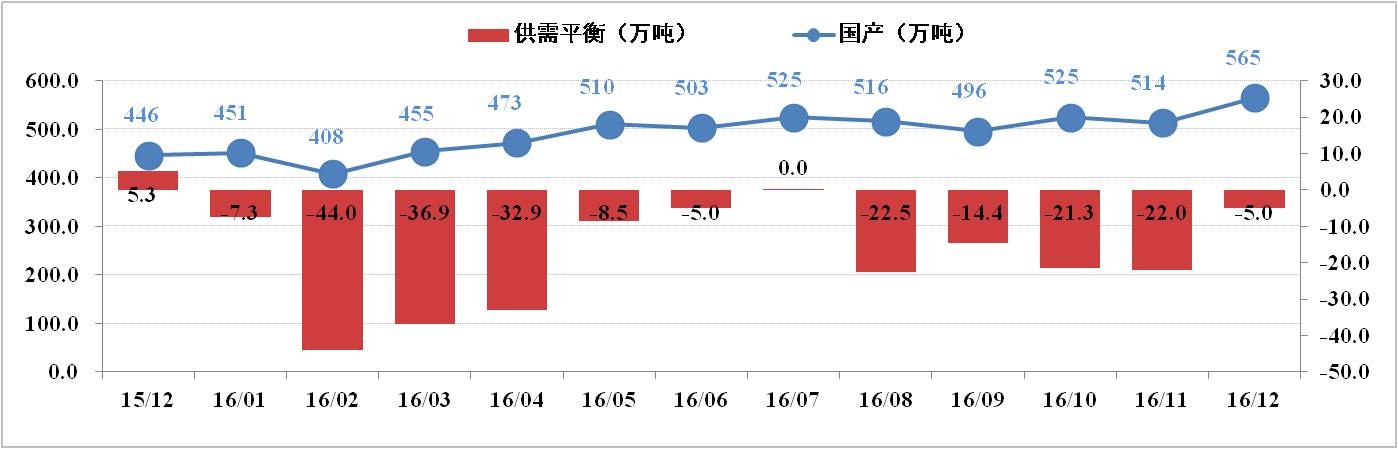 供給方面:12月份全國電解鋁有效產(chǎn)能為4,219.5萬噸,運行產(chǎn)能3,615.3萬噸,開工率為85.68%。其中,12月份電解鋁總產(chǎn)量為294.2萬噸,日化產(chǎn)量9.49萬噸,供應(yīng)持續(xù)增加。調(diào)研數(shù)據(jù)顯示,2016年國內(nèi)電解鋁已累計減產(chǎn)88.4萬噸;累計復(fù)產(chǎn)242.55萬噸,待復(fù)產(chǎn)約60萬噸;新產(chǎn)能已投產(chǎn)393.8萬噸,待投產(chǎn)71萬噸。