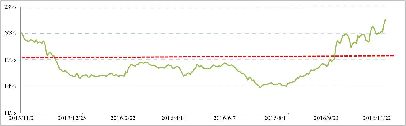 滬鋁三月比例價方面,11月滬鋁三月合約下行趨勢明顯,月末加權(quán)平均價報收于13,118元/噸。若按17.6%氧化鋁作價比例,2017年1月份全國氧化鋁長單加權(quán)價格為2,309元/噸,與現(xiàn)貨加權(quán)價格的價差擴大到646元/噸。12月份期鋁全國氧化鋁現(xiàn)貨加權(quán)價與滬鋁三月加權(quán)平均價實際折算比例為22.95%。