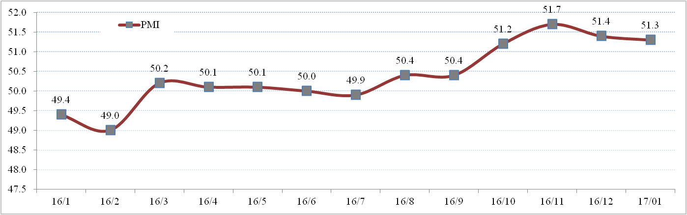 國家統(tǒng)計局?jǐn)?shù)據(jù)顯示,2017年1月份,中國制造業(yè)采購經(jīng)理指數(shù)(PMI)為51.3%,比上月微落0.1個百分點,連續(xù)6個月站上50%的榮枯線,延續(xù)平穩(wěn)擴張態(tài)勢。其中,生產(chǎn)指數(shù)和新訂單指數(shù)分別為53.1%和52.8%,分別較上月回落0.2和0.4個百分點。總的來看,反映供需變化的生產(chǎn)和新訂單指數(shù),延續(xù)去年四季度以來向好態(tài)勢,說明當(dāng)前供需基本面良好,增長態(tài)勢均衡。