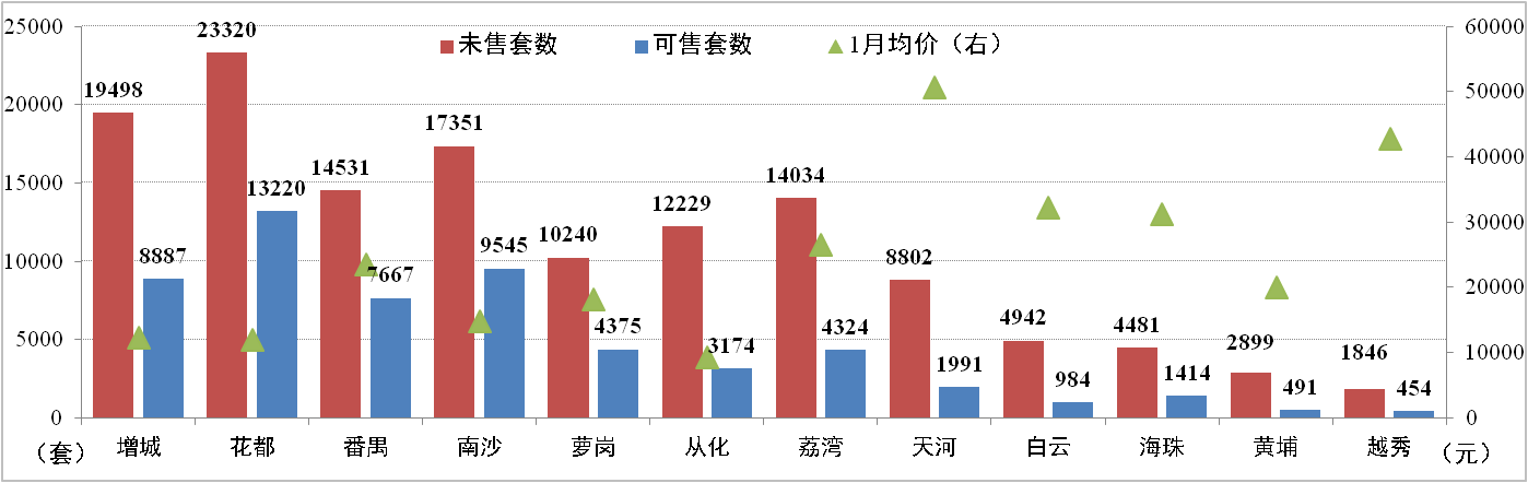 截止2月10日,廣州市新建住宅商品房共190,699套,環(huán)比減少2.72%。其中可售和未售房源分別為56,526套和134,173套,主要集中在花都、增城、南沙以及番禺四區(qū),合計(jì)分別占69.7%和55.7%;增城分別占15.7%和14.5%。