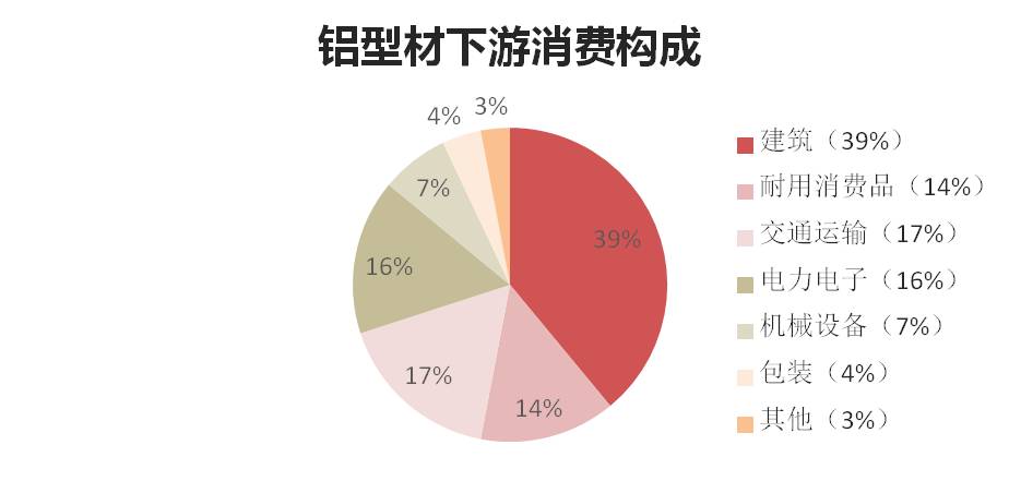 2017年鋁材的下游消費持有相對樂觀的預估,這主要還是基于對宏觀經濟整體終端需求的偏強判斷。在鋁材的下游消費構成中,主要在為建筑和交通、電力用鋁。其中,建筑(39%)、交通運輸(17%)、電力電子(16%)、包裝(4%)、耐用消費品(14%)、機械設備(7%)及其他(3%)。