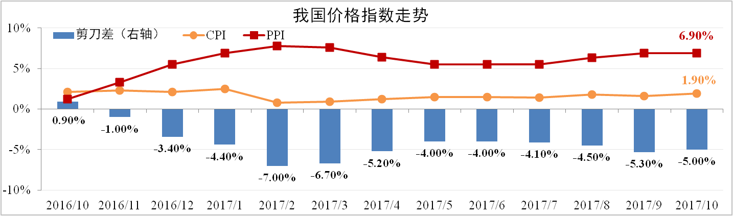 10月份我國(guó)CPI為1.9%,較上月擴(kuò)大0.3個(gè)百分點(diǎn),主要受食品價(jià)格跌幅縮小以及服務(wù)價(jià)格上漲所致。10月PPI為6.9%,超出市場(chǎng)預(yù)期,有色金屬礦石開(kāi)采以及石油價(jià)格上漲是主要支撐力量。