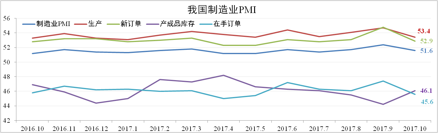 10月份我國(guó)官方制造業(yè)PMI為51.6,較上月回落0.8,達(dá)到年內(nèi)均值。從分項(xiàng)看,生產(chǎn)、新訂單與在手訂單紛紛下降,產(chǎn)成品庫(kù)存大幅上升,說(shuō)明下游需求不足,制造業(yè)活動(dòng)較上月放緩。