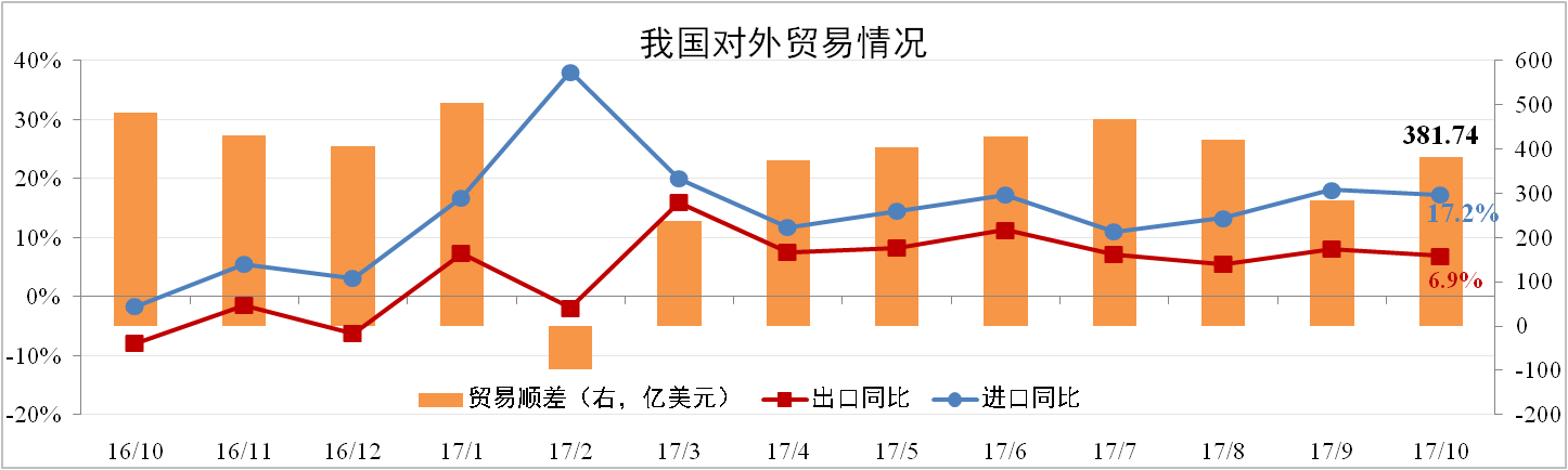 分析認(rèn)為:美、歐PMI均處于高點(diǎn),因此10月進(jìn)出口放緩與十一長(zhǎng)假和人民幣升值有關(guān)。由于國(guó)內(nèi)冬季限產(chǎn)內(nèi)需不足,同時(shí)高基數(shù)與CPI上漲使企業(yè)出口承壓,預(yù)計(jì)11月進(jìn)出口繼續(xù)回落。