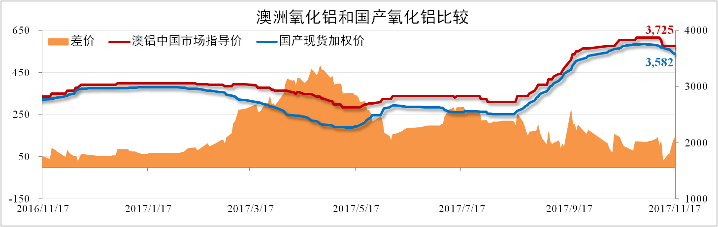 10月份,國產氧化鋁價格上漲幅度過大,進口氧化鋁價格繼續緩慢跟漲。截止11月17日,澳洲氧化鋁中國市場指導價為3,725元/噸,環比下降2.61%,國內氧化鋁加權價格3,582元/噸,環比下降3.20%,價差達到143元/噸。