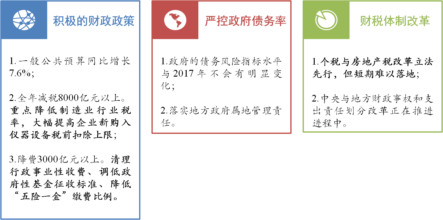 分析認(rèn)為:地方政府專項(xiàng)債、中央基建投資分別較2017年增加5500億、300億元,因此今年財(cái)政政策較去年只強(qiáng)不弱。另外減稅降費(fèi)將進(jìn)一步降低企業(yè)稅負(fù),提高企業(yè)競爭力,釋放市場活力。