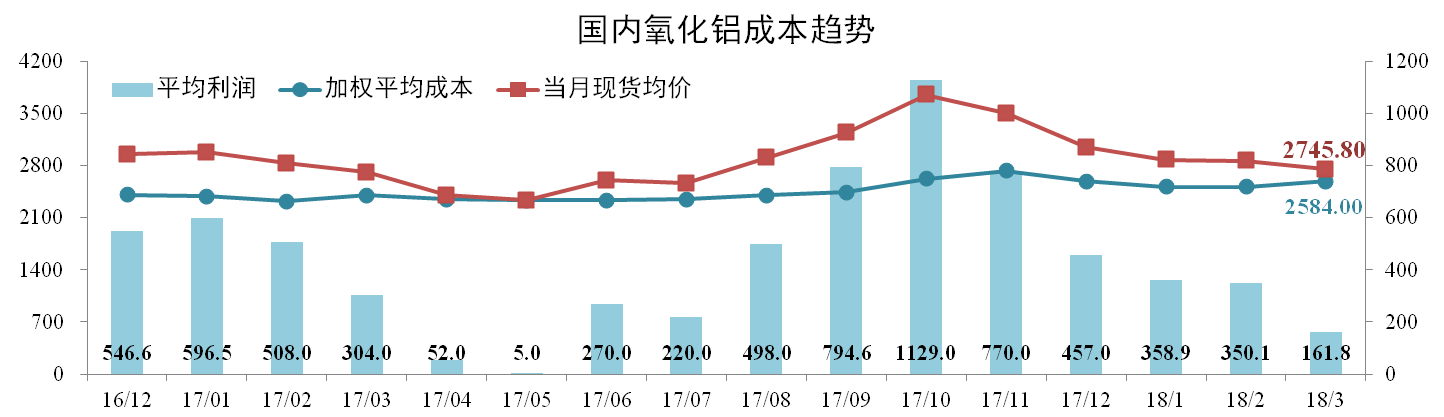 分析認為:3月份煤炭價格持續下滑,但燒堿持續沖高疊加山西礦石整頓導致的礦石預期緊張,推升3月份氧化鋁成本線上移。鋁錠庫存下滑帶動鋁價上漲,氧化鋁需求上漲將帶動拉動價格,預計氧化鋁利潤空間有所擴大。