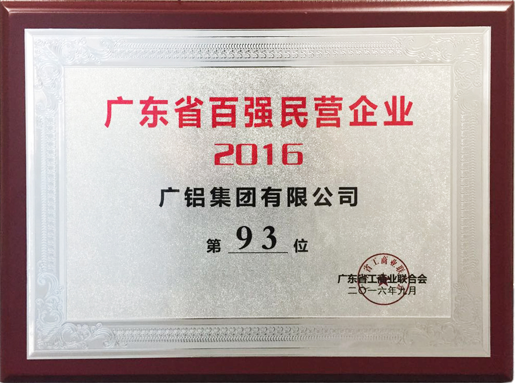 9月22日,省工商聯公布2016廣東省百強民營企業榜單,廣鋁集團有限公司光榮入榜,位列第93位,并被授予“2016廣東省百強民營企業”牌匾。