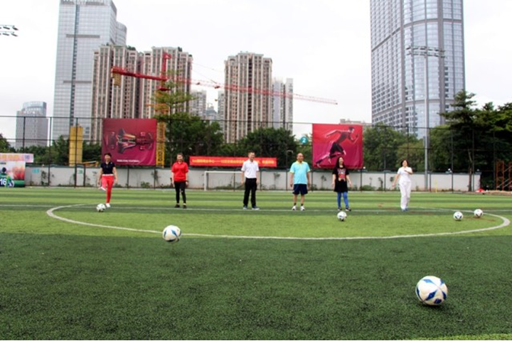 隨著裁判一聲哨響,四位領導嘉賓在球場中央將球踢向前方,宣布本次賽事正式開賽。