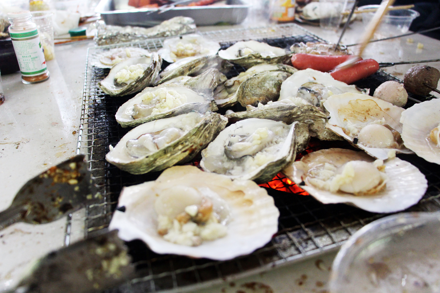 當食物擺滿桌面,各位燒烤達人已經摩拳擦掌,迫不及待想要一展身手。各位吃貨也被彌漫周圍的烤肉香引得口水直流。一串串烤肉、一塊塊雞腿,更有肥美無比的生蠔,不僅消除了大家一周工作中的疲勞,也在美味中拉近了大家的距離。