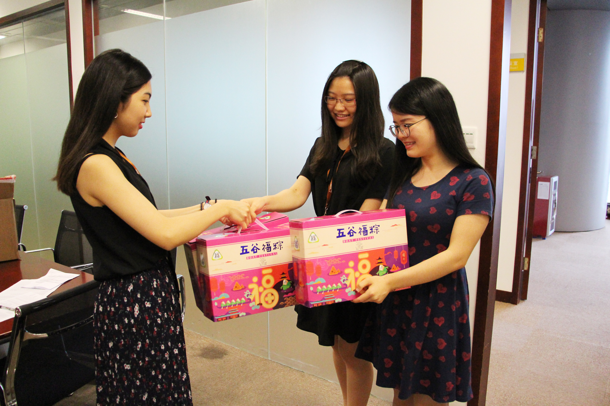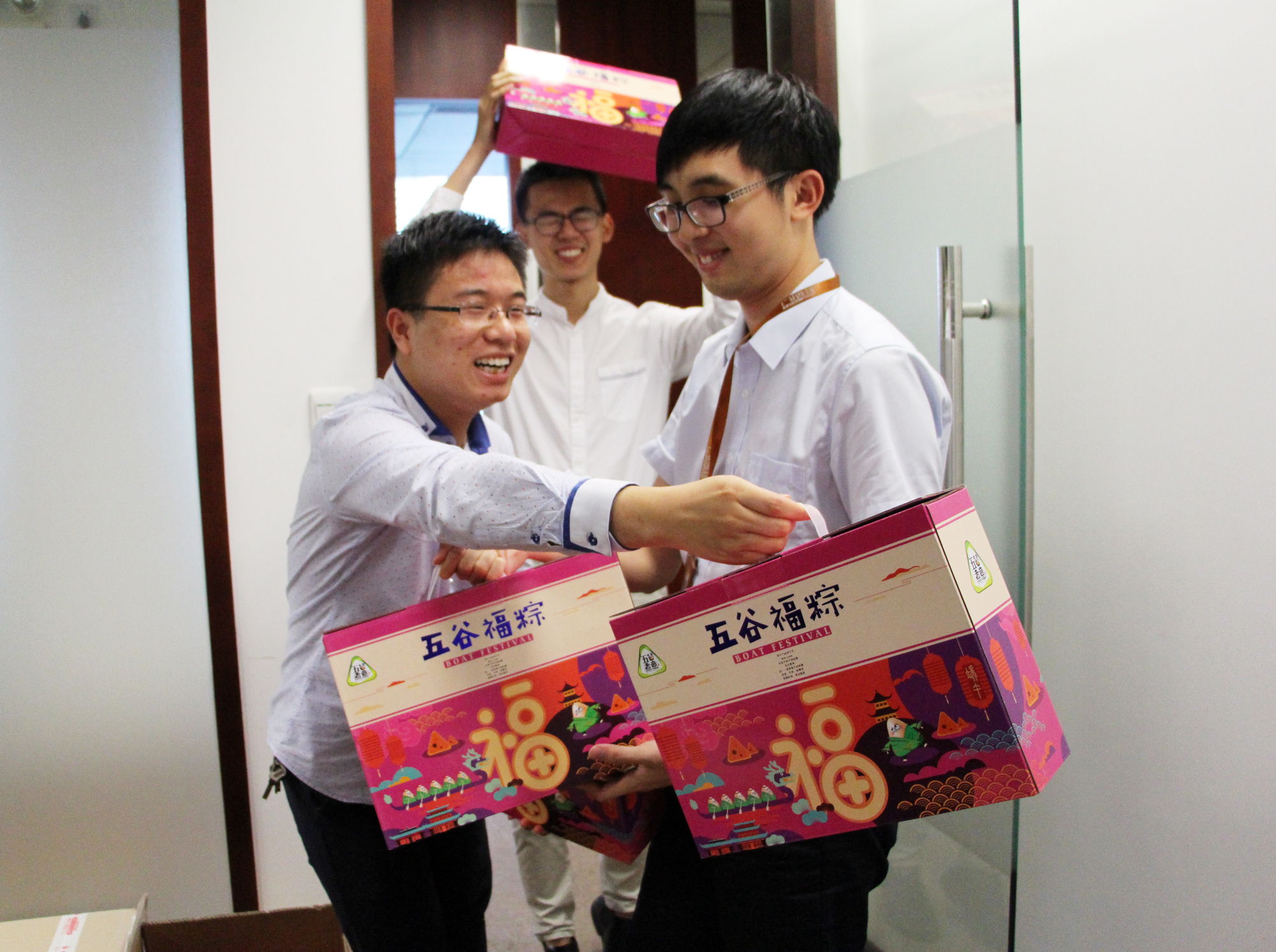 當(dāng)天下午兩點(diǎn)整,整整十四個(gè)大箱子,滿滿的粽子禮盒出現(xiàn)在辦公室中,強(qiáng)烈的視覺效果引起了員工們的小小期待。