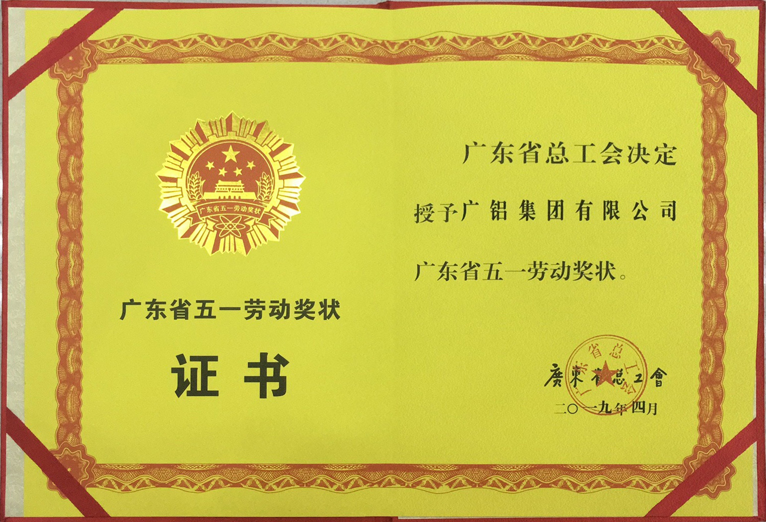喜訊:廣鋁集團榮獲2019廣東省五一勞動獎狀
