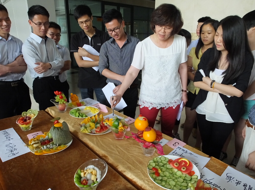 下午三點,比賽在總部一樓大廳正式開始。在主持人的一聲令下,參賽選手挑選自己需要的材料后立即投入到比賽之中。盡管不是專業的廚師,但選手們依然充滿熱情,展現出自己心靈手巧和別出心裁的一面。選手們在享受比賽的樂趣之余也不忘伸出友誼之手,面對對手交換水果、請求幫助的要求,他們同樣慷慨相助。比賽中,參賽選手完美配合,將團隊協作發揮到淋漓盡致,一個多小時后,一盤盤色香味俱全的水果拼盤紛紛出爐。最終,企管事業部鄧雯雯和譚鴻玲奪得本次比賽冠軍,營銷服務處吳小燕和周素歡獲得二等獎,企管事業部周艷華和黃詩敏獲得三等獎,結算事業部江潔玲和周艷妃獲得最佳創意獎。