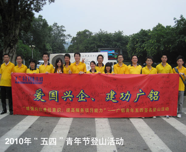 4月30日,集團公司40余名青年團員積極參加了廣鋁集團“愛國興企、建功廣鋁”簽名活動,活動在公司行政辦公樓1樓會議廳敲響鑼聲。隨后,廣大青年團員向廣州著名的景點——白云山奮勇進發,展現勇者的風采與青春的飛揚。4月的白云山春意盎然,鳥語花香,鮮紅的廣鋁橫幅在蔥綠的白云山上顯得格外耀眼,在兩個多小時的登山過程中,我們欣賞著沿途的美麗景色,歡聲笑語中已至最高峰。