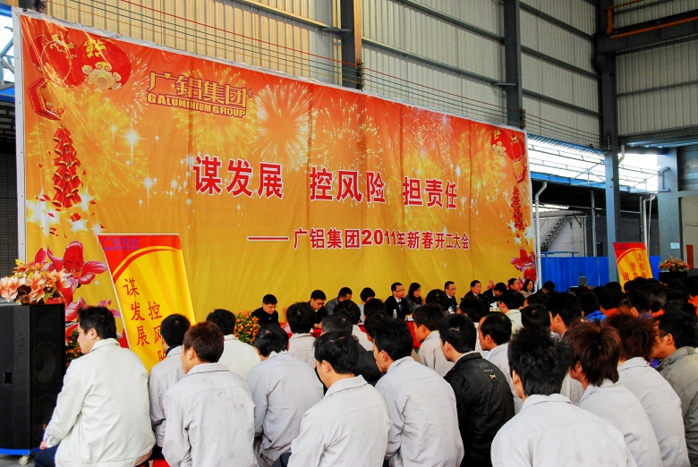 當天下午,王副總裁等高層領導又不辭辛勞的前往麻涌生產基地舉行開工大會,次日又前往南海生產基地舉行開工大會,將廣鋁集團“家天下”的精神傳承到每位廣鋁人的心中,號召全體員工繼續努力,為廣鋁開創新的天地,鑄造新的輝煌,相信在新的一年里廣鋁集團將迎來更輝煌的明天!