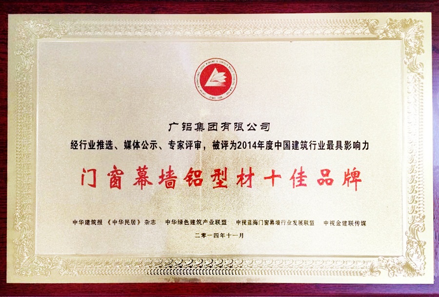 After more than three months, the list of the most influential “Top Ten Brands of Aluminum Profile for Door, Window and Curtain Wall” in Chinese construction industry of 2014, has finally came out in November. Galuminium Group received this honor by its strong comprehensive strength and market impact.