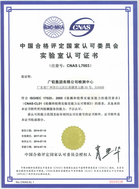 Complying with the requirements of ISO / IEC 17025:2005 General Requirements for the Competence of Testing and Calibration Laboratories (i.e. CNAS-CL01 Accreditation Criteria for the Competence of Testing and Calibration laboratories), Galuminium Group Co., Ltd. Testing Center passed CNAS' accreditation officially on July 15, 2014 (while the certificate was obtained on July 22) and is qualified for testing services listed in the appendix of the certificate. The Testing Center of the Company can use CNAS National Laboratory Accreditation Mark within the scope of certification and accreditation, and at the same time, it will be inscribed on the directory of certification and accreditation institutions approved by CNAS. The Testing Center will obtain registration, release information and accept supervision and audit of certification and accreditation institution on the CNAS official website, which will significantly improve the Company's visibility, enhance its market competitiveness among other peers in the industry and lay a solid foundation for its long-term development.