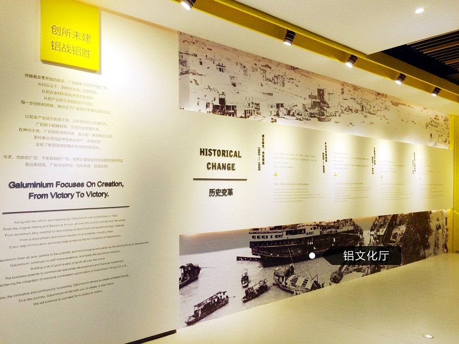廣鋁文化廳以簡潔大方的質感設計風格,大膽運用了“廣鋁黃”和“廣鋁灰”兩種VI主色調,盡顯穩重、進取,創意,從立體視覺空間賦予每位觀眾最為直接的思想沖擊,鏗鏘有力,而又溫和自然。與廣鋁文化廳所不同的是,鋁生活館采用了現實主義設計理念,分別從建筑材和工業材兩個角度賦予鋁產品最為直觀的展現手法,同時植入了象征性和意識流兩種現實主義基因,從生活的角度改寫了鋁產品給人冰冷的傳統色澤。擁有國內外最為完整的鋁全產業鏈是廣鋁集團的核心競爭優勢之一,同時也是廣鋁集團經營發展理念的重要體現。